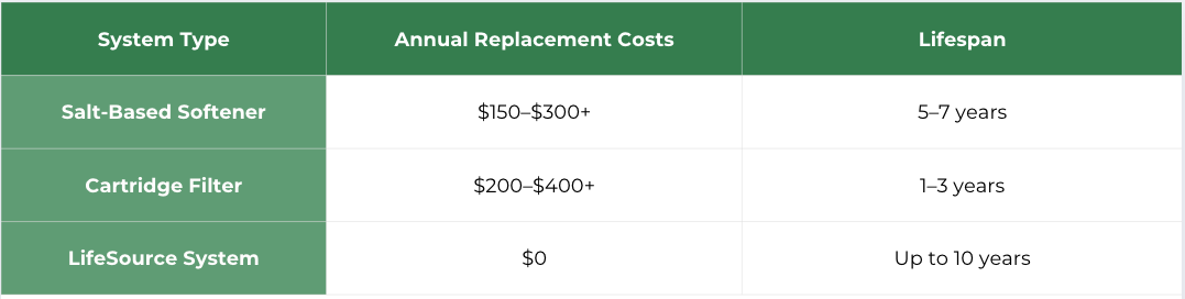 Aside from cost, there's the hassle: lifting heavy salt bags, tracking replacement schedules, and dealing with brine discharge. A salt-free system eliminates these costs entirely, with no waste, no salt, and no ongoing chemical dependency.
